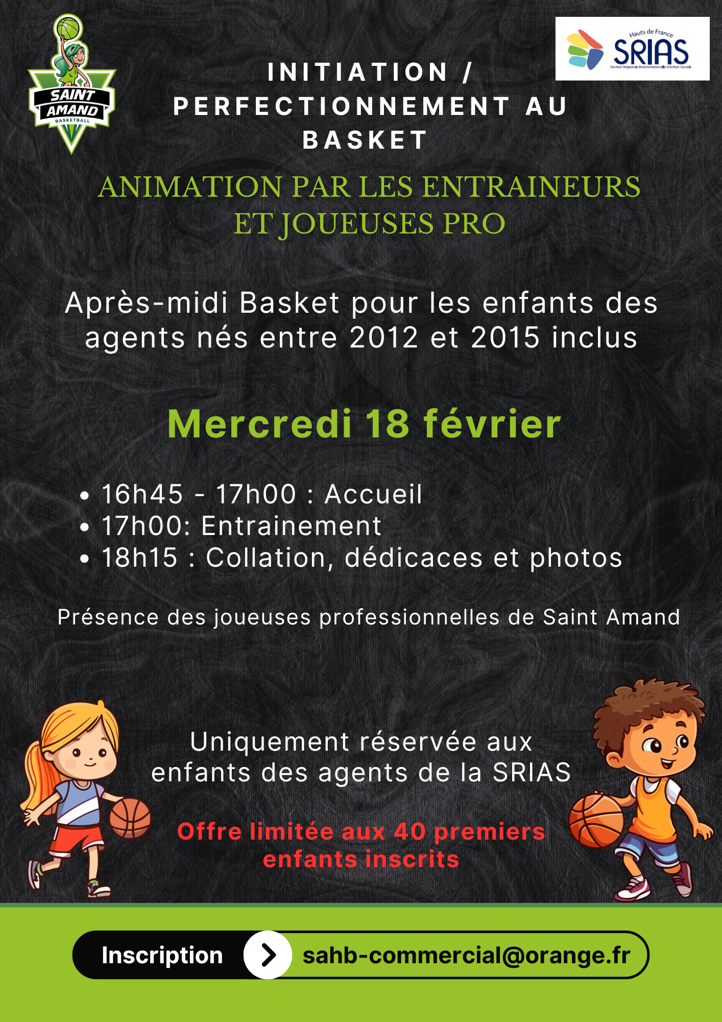 Initiation et perfectionnement au basket le mercredi 18 février 2026 pour les enfants nés entre 2012 à 2015 inclus.